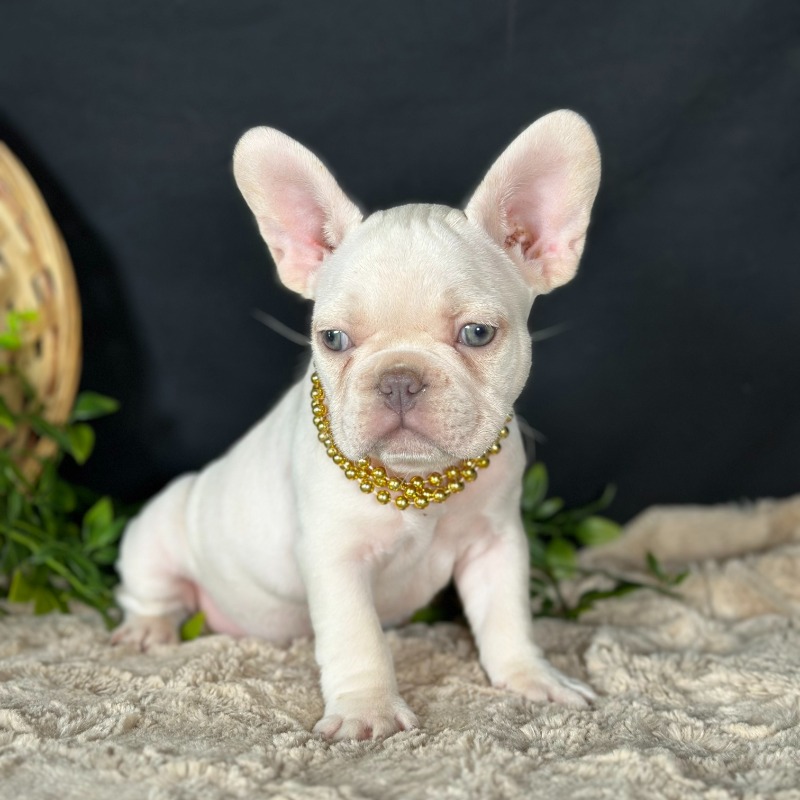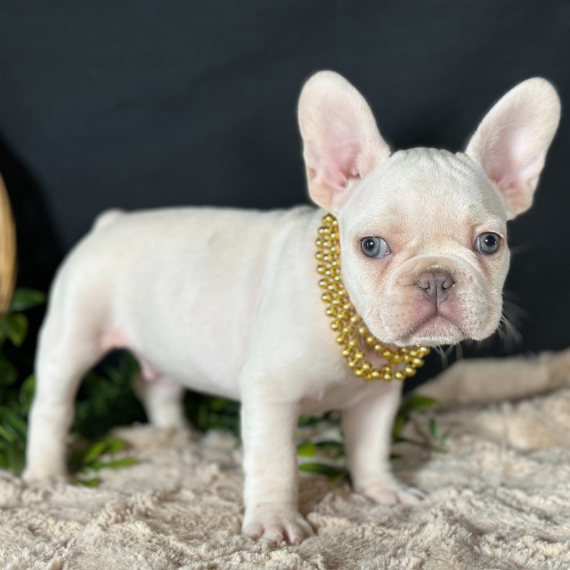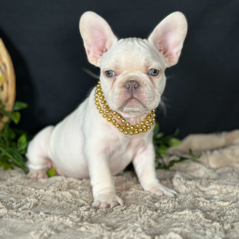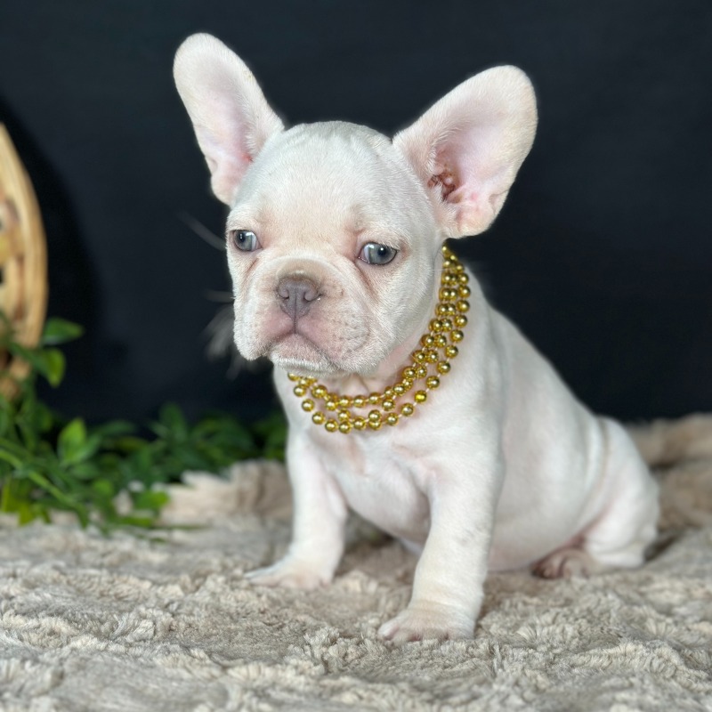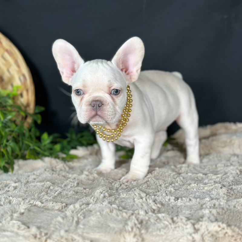 Introducing Charlie, a stunning male French Bulldog with a rare and sought-after Platinum coat. Born on December 1st to Minnie and Golden Boy, Charlie is the definition of high-quality breeding and charm. Beyond his striking light coat and soulful eyes, he is a powerhouse of geneticpotential; he carries Testable Chocolate and is a confirmed future Isabella Producer, making him an incredible prospect for those looking to add elite DNA to their program. With DNA results pending for the Fluffy gene, Charlie represents the very best of Frenchie luxury and is sure to be the star of any household or high-end breeding vision.