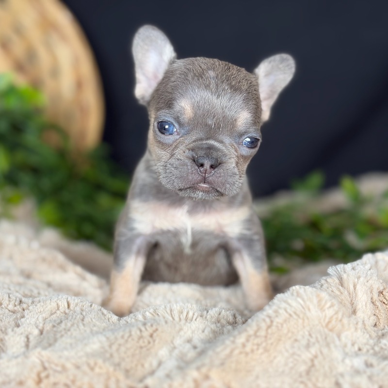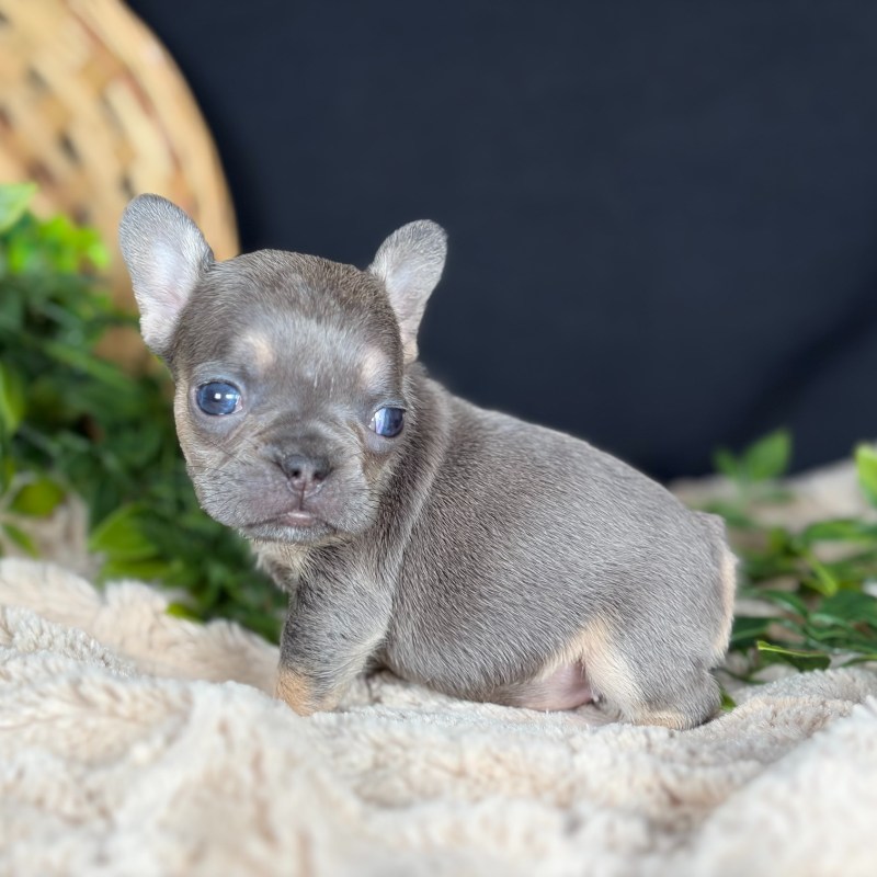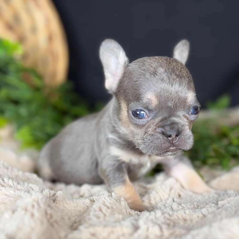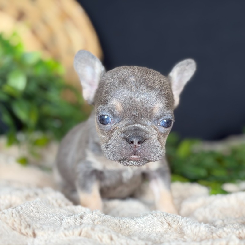 Meet Lassie, a breathtakingly beautiful female French Bulldog with a rare and sophisticated Lilac & Tan coat. Born on December 1st to parents Minnie and Golden Boy, this little sweetheart is already showing off the compact, stocky frame and adorable features that make the breed so iconic. Her genetics are as impressive as her looks; she carries Testable Chocolate and is currently pending DNA results for the Fluffy gene, making her a premier choice for those seeking top-tier quality and unique heritage. Whether she is napping in the palm of your hand or snuggling up for a snooze, Lassie’s gentle temperament is sure to capture your heart.